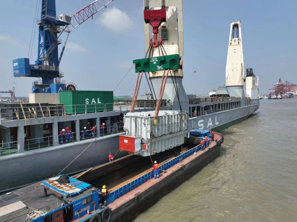 本次發(fā)運(yùn)的主變壓器本體運(yùn)輸重量為286噸,采用德國(guó)SAL公司旗下起吊能力達(dá)2000噸的重吊船進(jìn)行裝運(yùn)。設(shè)備發(fā)運(yùn)過(guò)程中,國(guó)際公司物流管理團(tuán)隊(duì)根據(jù)設(shè)備出廠時(shí)間靈活選擇裝運(yùn)船舶、高效制作運(yùn)輸方案、精準(zhǔn)把控受載船期,高質(zhì)量完成了本次裝船作業(yè),成功邁出了主變壓器本體多式聯(lián)運(yùn)工作的第一步,為即將到來(lái)的總行駛里程近28000公里的洲際遠(yuǎn)洋運(yùn)輸、內(nèi)河內(nèi)海運(yùn)輸、跨國(guó)內(nèi)陸運(yùn)輸夯實(shí)了基礎(chǔ)。